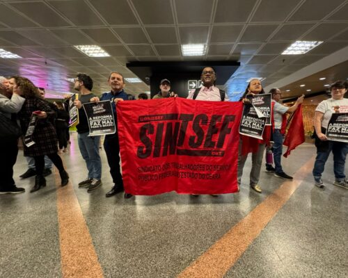 Pela manhã, representantes do sindicato marcaram presença no Aeroporto Internacional Juscelino Kubitschek, recepcionando parlamentares com faixas, cartazes e palavras de ordem contrárias à proposta de Reforma Administrativa. A mobilização visou pressionar os congressistas e evidenciar o posicionamento dos servidores diante da ameaça de desestruturação do Estado.